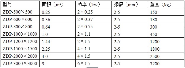 注:此表為上、下振形式振動平臺技術(shù)參數(shù),僅供參考;此外可以根據(jù)用戶實際使用需要定做臺面大小來選用振動電機數(shù)量及功率。
