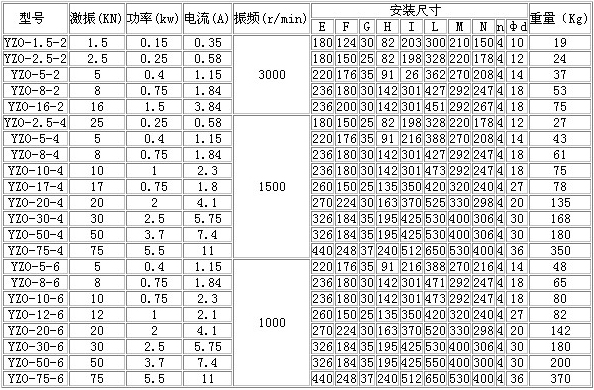 YZO系列振動電機(jī)技術(shù)參數(shù)